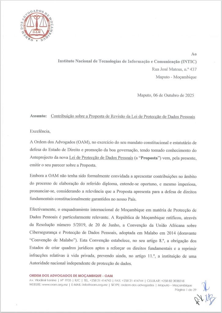 Contribuição da OAM sobre a Proposta de Revisão da Lei de Protecção de Dados Pessoais Acesse o documento completo através do Link: Saiba Mais