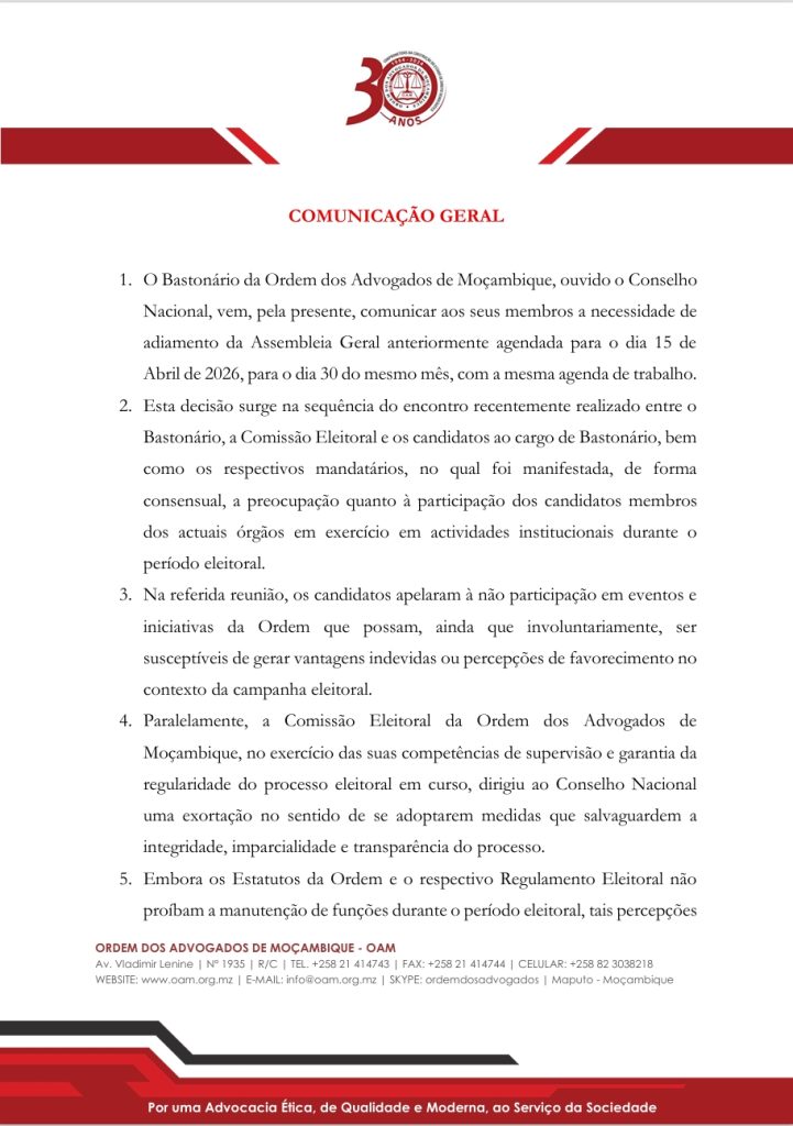 COMUNICAÇÃO GERAL O Bastonário da Ordem dos Advogados de Moçambique, ouvido o Conselho Nacional, vem, pela presente, comunicar aos seus membros a necessidade de adiamento da Assembleia […]