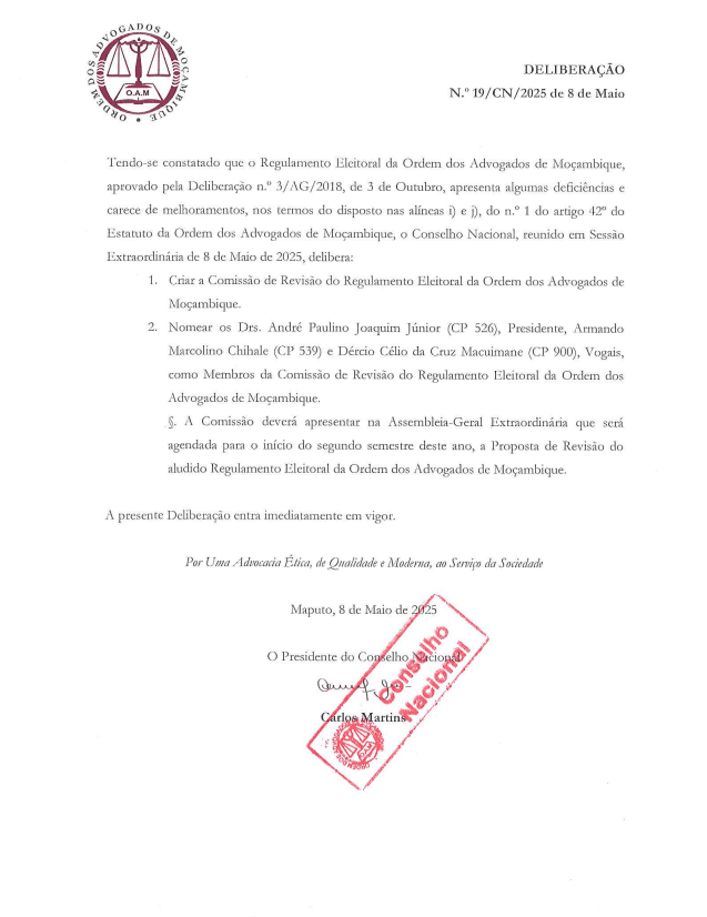 Deliberação nº 19_CN_2025_de 08 de Maio_Comissão de Revisão do Regulamento Eleitoral da OAM